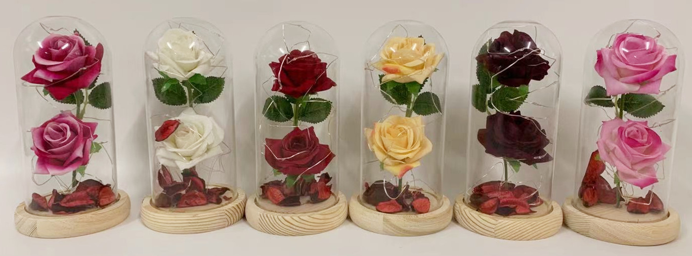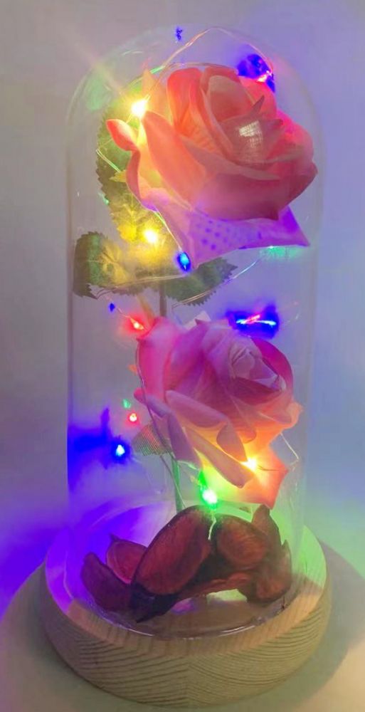 Pink color rose flower with glass cover and wooden base