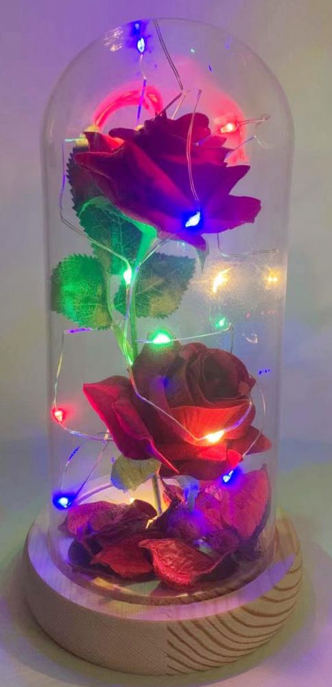 Red color rose flower with glass cover and wooden base